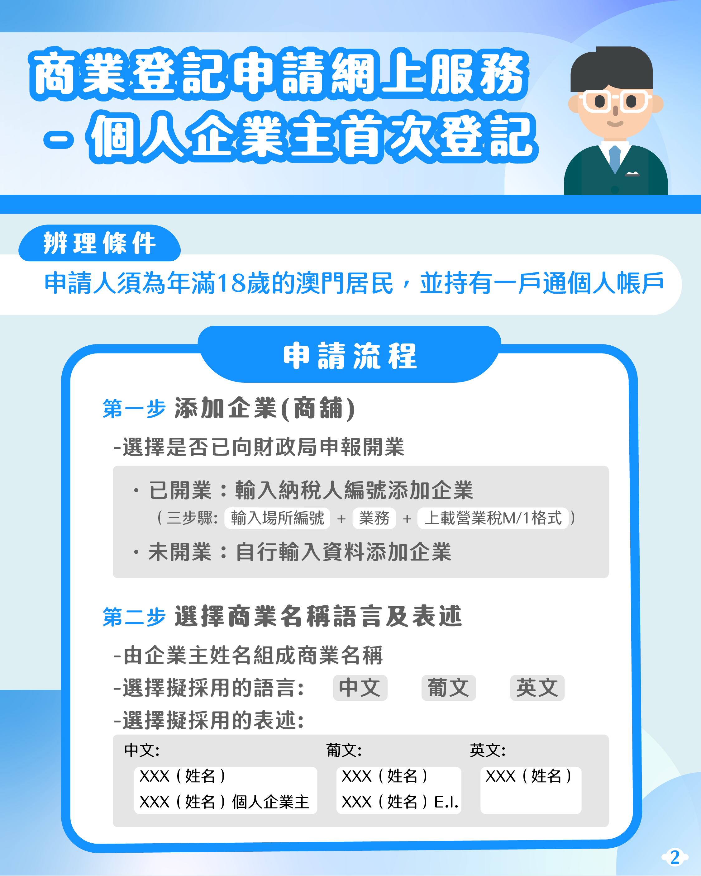 在商業登記方面,新推出的自然人商業企業主首次登記、變更自然人商業企業主住所(地址)、註銷自然人商業企業主登記的全程電子化服務,均可透過“商社通”提交申請,實現指尖辦事新模式。申請人完成線上資料提交及繳付登記費,登記局即時接收有關申請,審批完成後,申請人即可在線上領取登記副本。