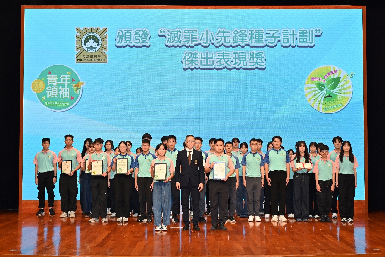為配合澳門特區政府青年政策,增強青少年的愛國愛澳思想,提升社會責任感和法治意識,司法警察局舉辦第七屆“社區安全青年領袖計劃”及第十二屆“滅罪小先鋒種子計劃”結業禮暨新一屆計劃啟動禮。司警局薛仲明局長勉勵學員遵紀守法、維護正義,將所學所得轉化為服務社會的實際行動,為青年群體樹立榜樣,為維護國家與澳門安全貢獻青年力量。