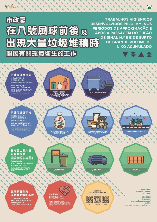 "韋帕"正逼近本澳,同時正值天文潮,低窪地區有機會出現風暴潮水浸。為應對可能出現的環境衛生狀況,市政署呼籲大眾配合當局在颱風前後所展開的垃圾收集及清運措施,妥善處理及棄置垃圾,減低颱風襲澳對市面造成的影響,提升垃圾清運的效率。另外,呼籲食品業界做好防浸或清理善後措施,對食品及貨物作出妥善的保護,避免受到污染。