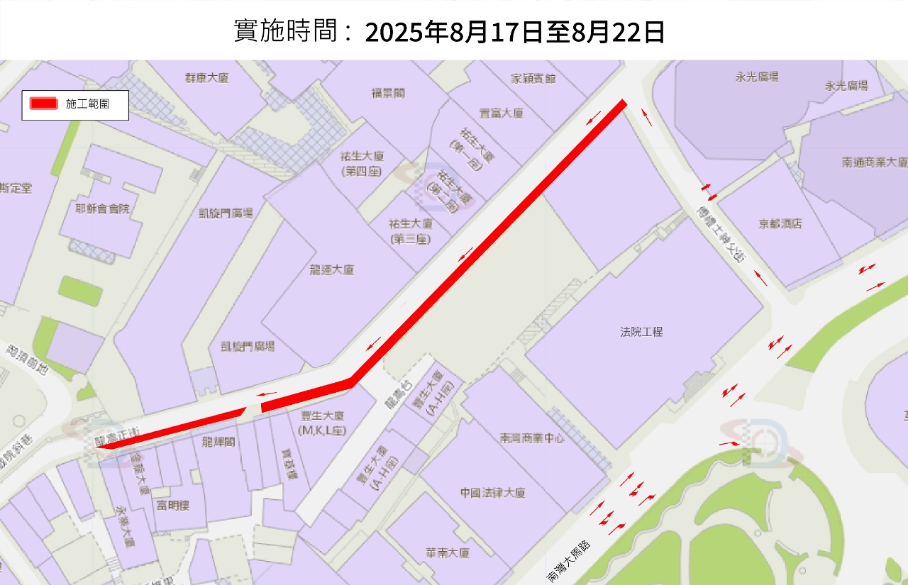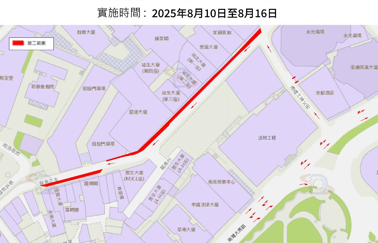 南灣大馬路法院大樓工程的管線接駁工作自本年6月16日起分三階段有序推進,首階段施工已於7月12日按時完成。現時正進行第二階段施工,預計可於8月10日按時完成,並於同日緊接開展第三階段施工。屆時,南灣大馬路將恢復正常通車,龍嵩正街繼續維持有限度通車,龍嵩正街近凱旋門廣場的輕型汽車咪錶泊車位和電單車泊車位繼續維持禁止泊車。