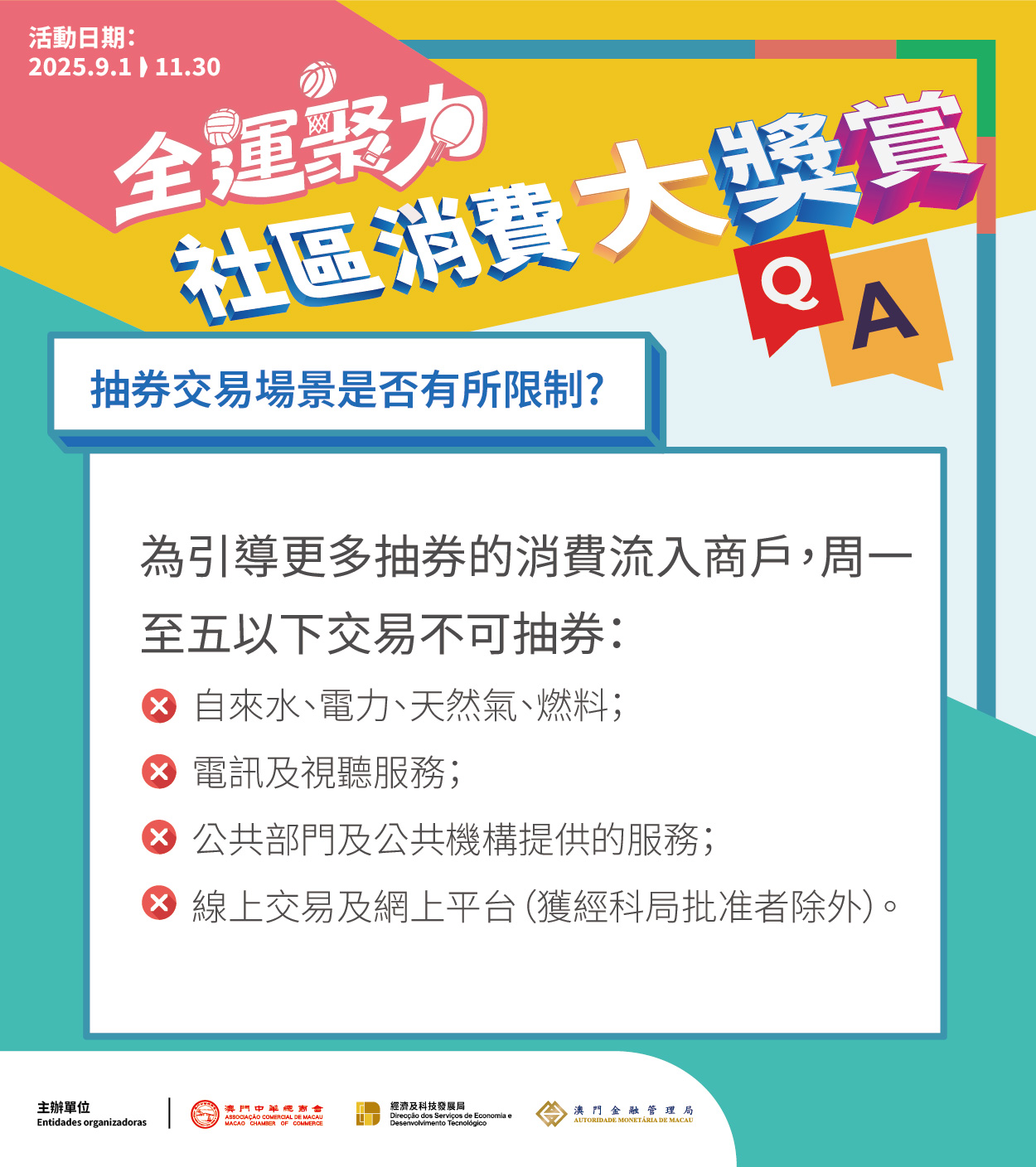 為引導消費流入社區,以下交易不能獲抽取電子優惠機會,包括自來水及電力、天然氣及燃料、電訊及視聽服務、公共服務機構、線上交易及網上平台。