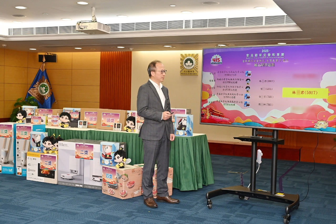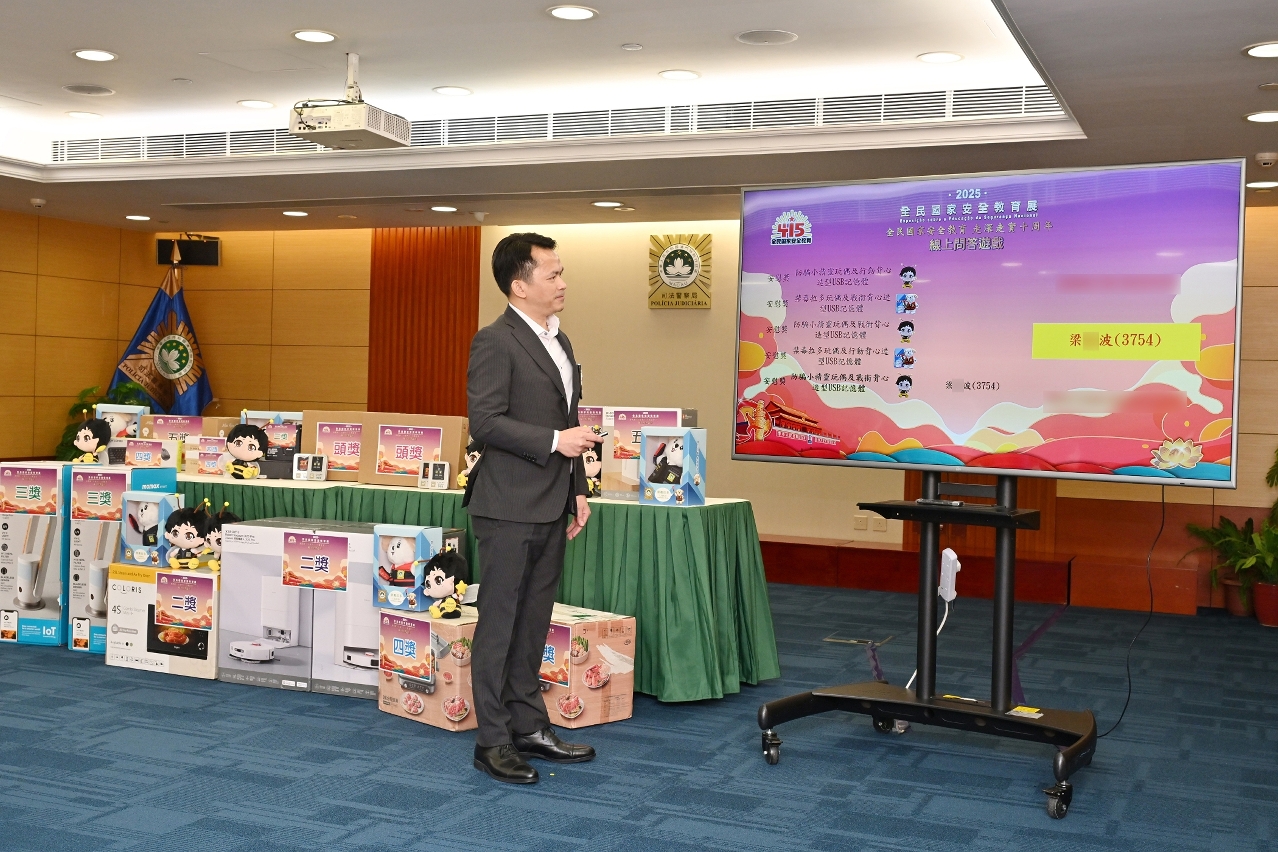 是次活動大眾反應踴躍,逾67,000人次參與。抽獎儀式由司警局薛仲明局長,以及賴文威、蘇兆強、岑錦榮三位副局長共同主持,經電腦隨機抽出 2名頭獎、3名二獎、4名三獎、5名四獎、6名五獎及20名安慰獎合共40名得奬者,得獎名單已上載至“全民國家安全教育展”專題網頁(https://eesn.gov.mo)、司警局網頁(https://www.pj.gov.mo) ,以及在司警局微信、Facebook、Instagram、微博、小紅書等官方帳號公佈,並由專人通知得獎者領獎事宜。公眾如有查詢,可於辦公時間致電 63301844。
