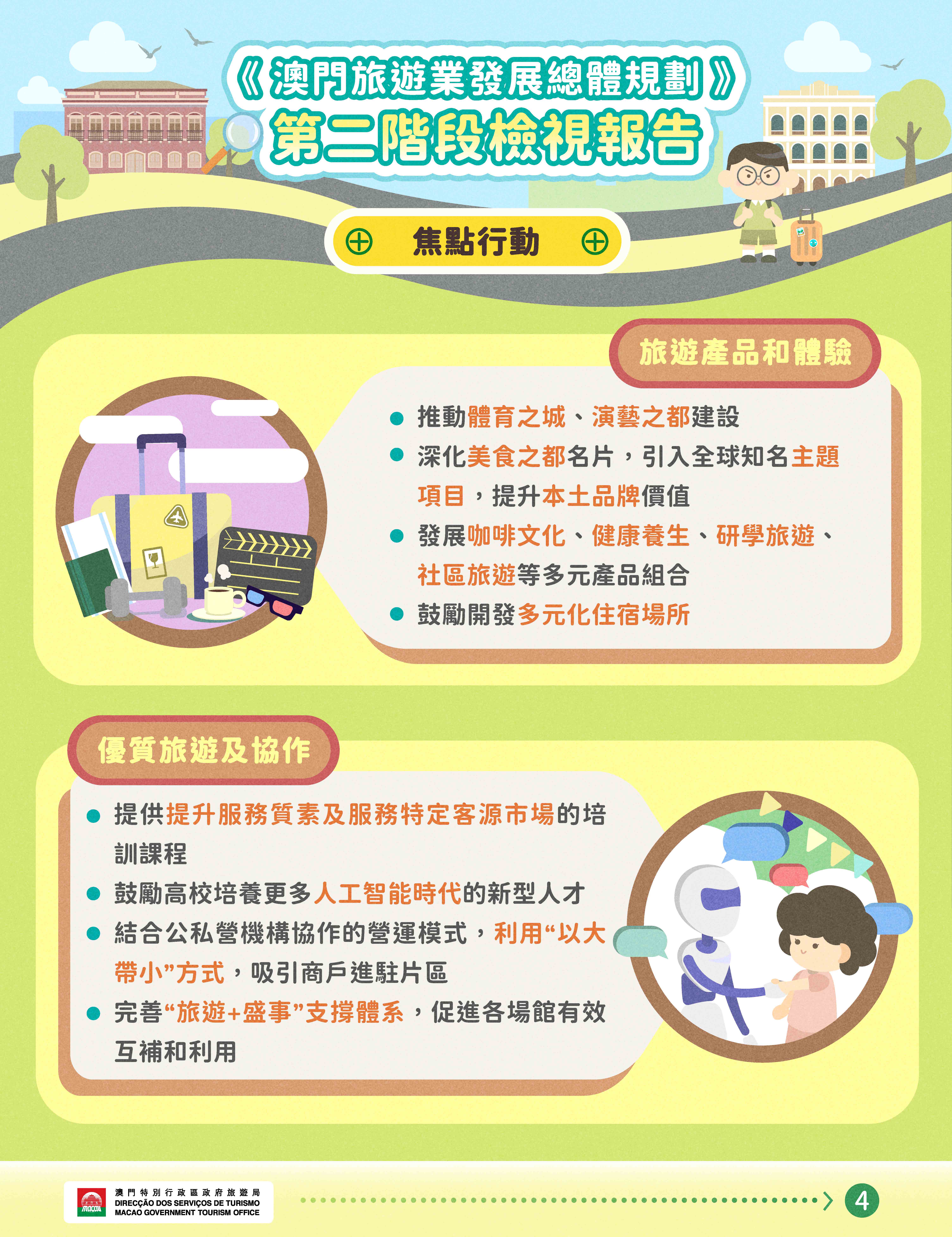 當中焦點行動包括發展多元產品組合,引入全球知名主題項目,提升本土品牌價值;提供針對特定客源市場的培訓課程,培養人工智能時代的新型人才;開展針對性的線上線下營銷推廣,發展聯程旅遊產品;拓展潛力旅遊發展空間,提升機場及口岸的接待能力;運用智慧科技提升旅客體驗,協助中小企業提升服務能力;加強與橫琴及粵港澳大灣區城市深度旅遊合作,促進國際交流等。