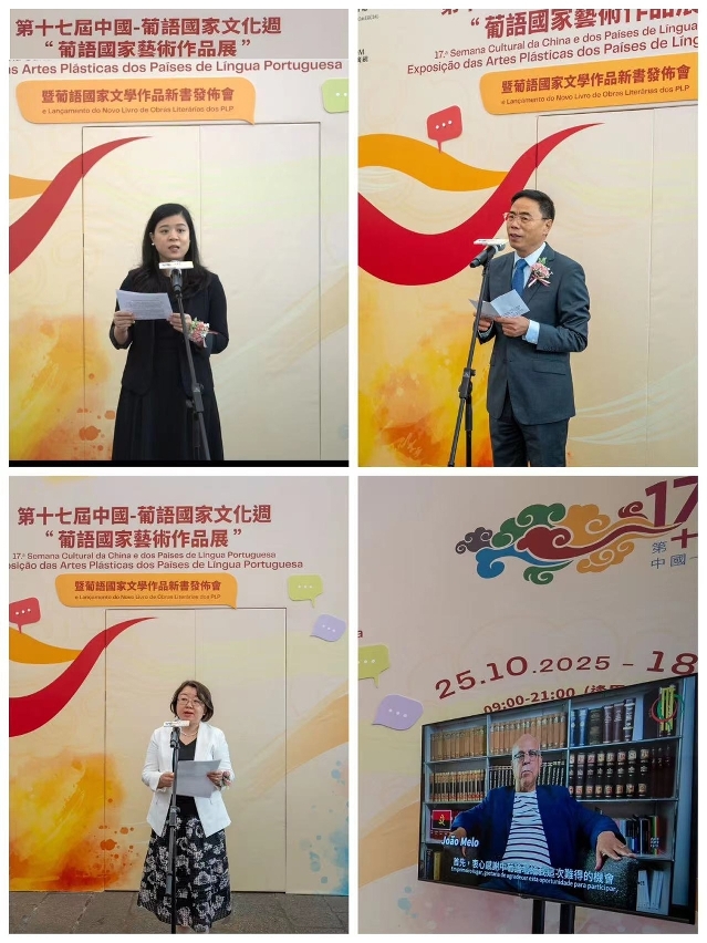 10月24日,第十七屆中葡文化週 “葡語國家藝術作品展開幕暨葡語國家文學作品新書發佈會”在澳門市政署畫廊隆重開幕。此次活動由中葡論壇(澳門)常設秘書處主辦,澳門特區政府、澳門中聯辦、葡語國家駐澳門總領事館代表、中葡論壇秘書處成員、文學出版界及院校代表等嘉賓出席。