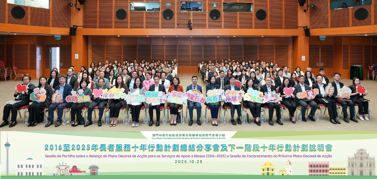 養老保障機制跨部門策導小組於10月28日下午假澳門科學館會議廳,舉行“2016至2025年長者服務十年行動計劃總結分享會及下一階段十年行動計劃說明會”,分享首個長者服務十年行動計劃的工作成果,並引介第二個十年行動計劃的重點內容。與會者包括公共部門代表、長者事務委員會委員、專家學者、專業團體、社會服務機構人員和長者代表等,約150人出席。