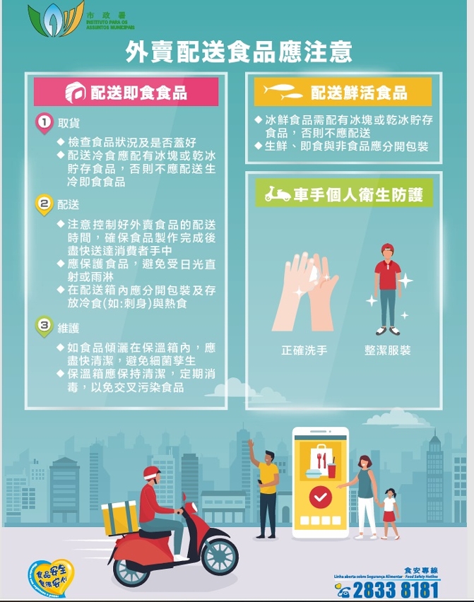 市政署已編製了一系列與網絡訂餐及配送服務相關的食品衛生操作指引及指南,包括《網絡訂餐配送服務的衛生指引》、《衛生操作指南─使用網上訂購餐飲及提供外賣配送服務(餐飲業界篇)》,以及《運送食品的衛生指引》、《衛生操作指南─運送食品篇》等,歡迎業界於市政署食安資訊網www.iam.gov.mo/foodsafety 查閱。