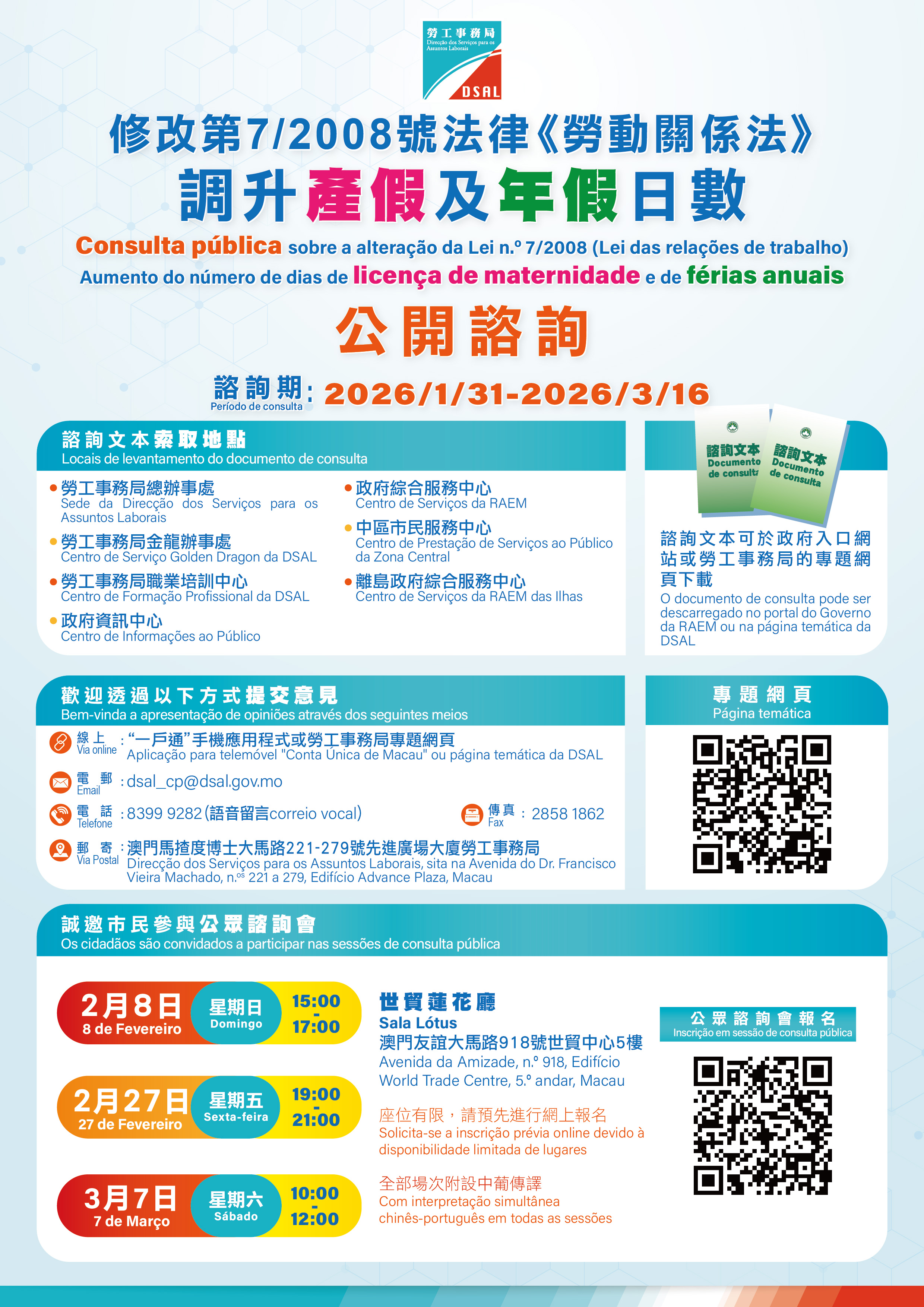 此外,勞工局於諮詢期內將繼續舉辦諮詢會,其中兩場面向公眾的諮詢會將分別於2月27日及3月7日,假澳門友誼大馬路918號世貿中心五樓蓮花廳舉行。公眾諮詢會以中文講解為主,並附設中葡傳譯服務,有意出席的市民請透過勞工局的專題網頁(https://www3.dsal.gov.mo/survey/labourlaw/)預先進行網上報名。