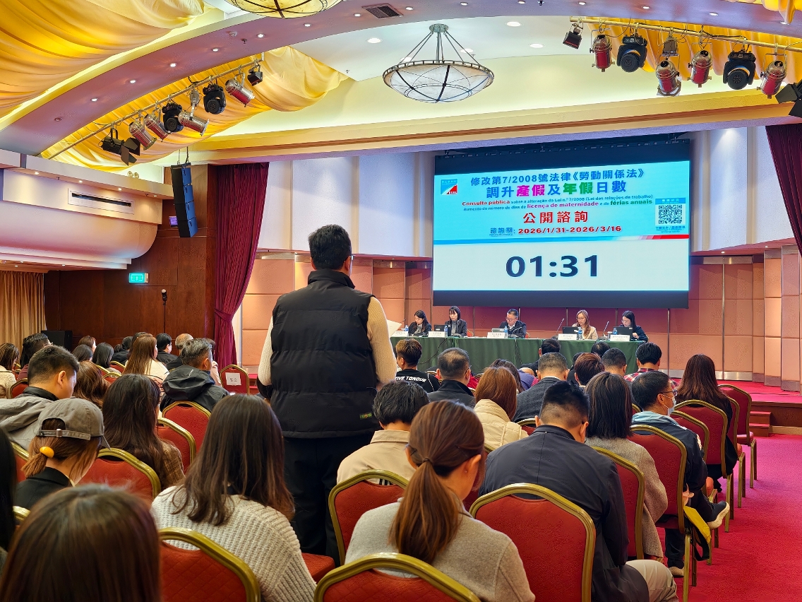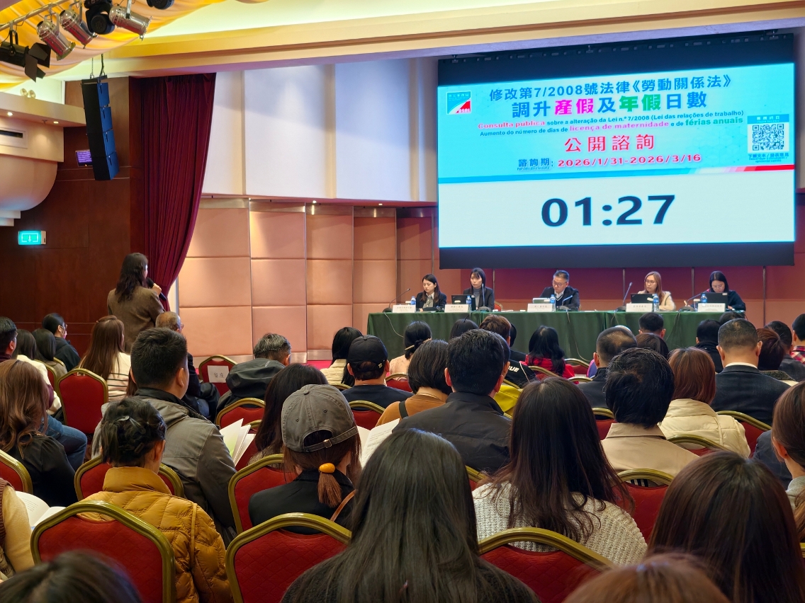 勞工事務局(下稱“勞工局”)正就修改第7/2008號法律《勞動關係法》關於調升產假及年假日數進行為期45日的公開諮詢,已於2月8日舉辦首場公眾諮詢會,並分別於2月4日及11日舉行了兩場面向僱員團體和僱主團體的專場諮詢會,廣泛聽取並收集社會各界的意見和建議。
