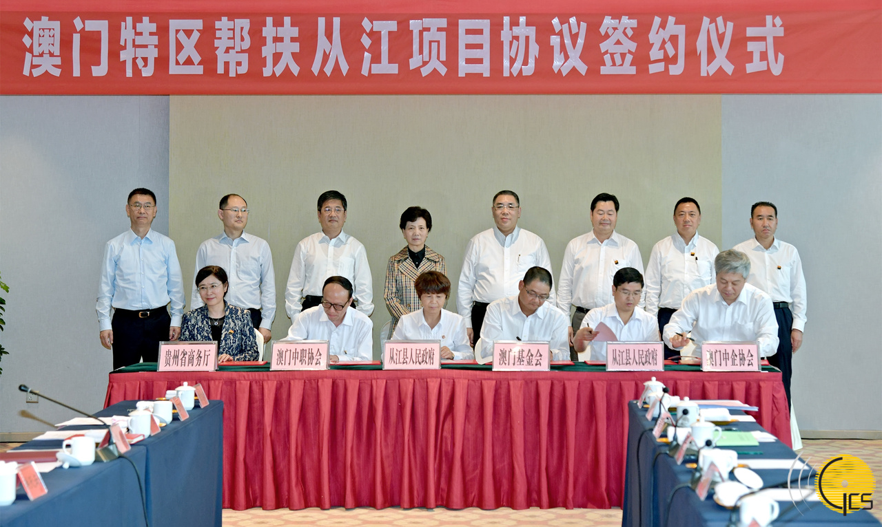 • The Chief Executive, Mr Chui Sai On, the Director of the Liaison Office of the Central People's Government in the Macao SAR, Mr Zheng Xiaosong, and the Governor of Guizhou Province, Ms Chen Yiqin, witness the signing of agreements covering: development on external trade and promotion of MICE sector cooperation; a scholarship scheme for disadvantaged students from Congjiang County to study in Macao higher education institutes; and reconstruction of an integrated teaching building in a Congjiang County school, during a ceremony held in Congjiang County, Guizhou Province.