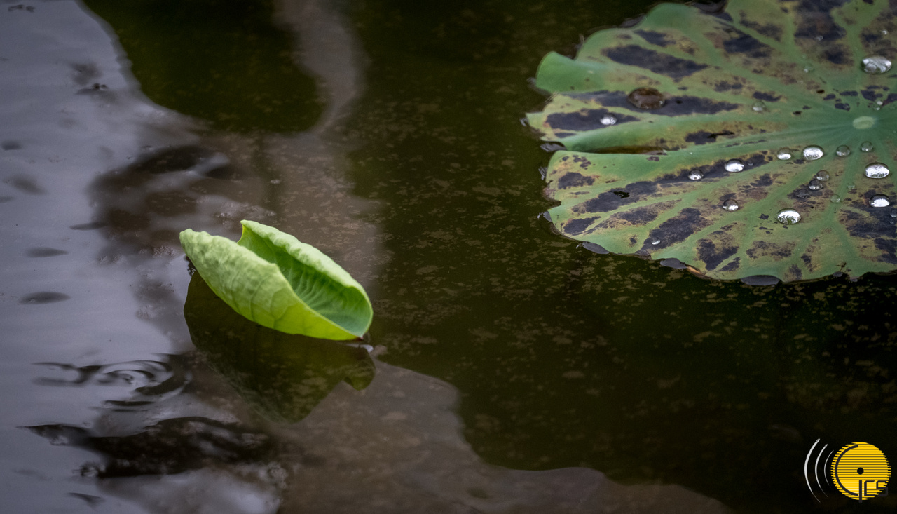 • A curled leaf section of a lotus plant drifts in rain-spattered water.