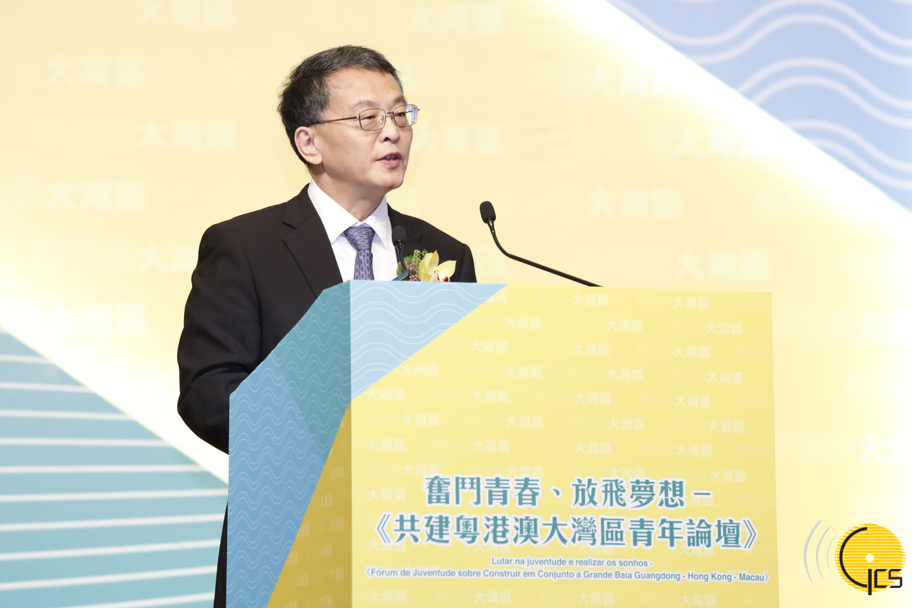 • The Director of the Policy Research and Regional Development Bureau of the Macao Special Administrative Region, Mr Mi Jian, delivers a keynote speech at the "Youth Forum on Jointly Building the Guangdong-Hong Kong-Macao Greater Bay Area".