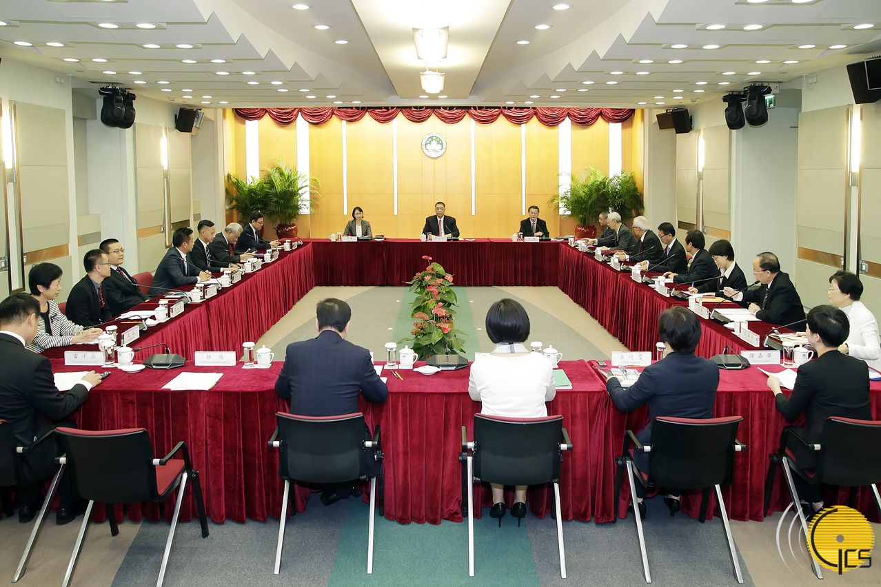 • The Chief Executive, Mr Chui Sai On, holds a meeting at the Government Headquarters with representatives respectively from the Grand Thought Think Tank and the Union of Macau Scholars to garner their suggestions and opinions for the 2019 Policy Address.