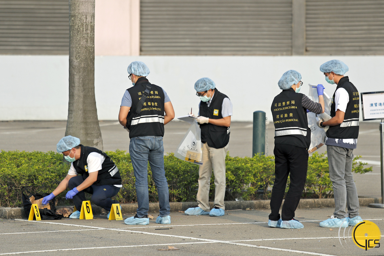 • Officers of the Judiciary Police investigate the crime scene after a controlled explosion. It is a simulation of a planned counter-terrorism exercise code-named “Bright Dog”.