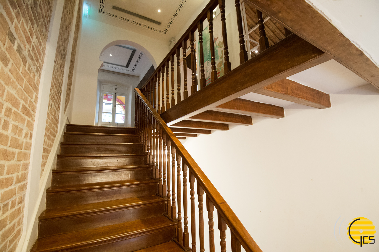 • The wooden staircase leads to a further collection of works by Prof. Jao, kept on an upper floor.