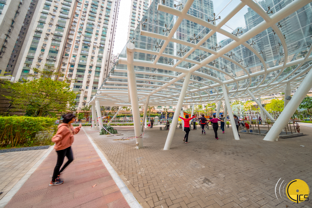 • A section in the park is covered by a steel, glass-covered canopy, making it a suitable spot for exercise even on rainy days.