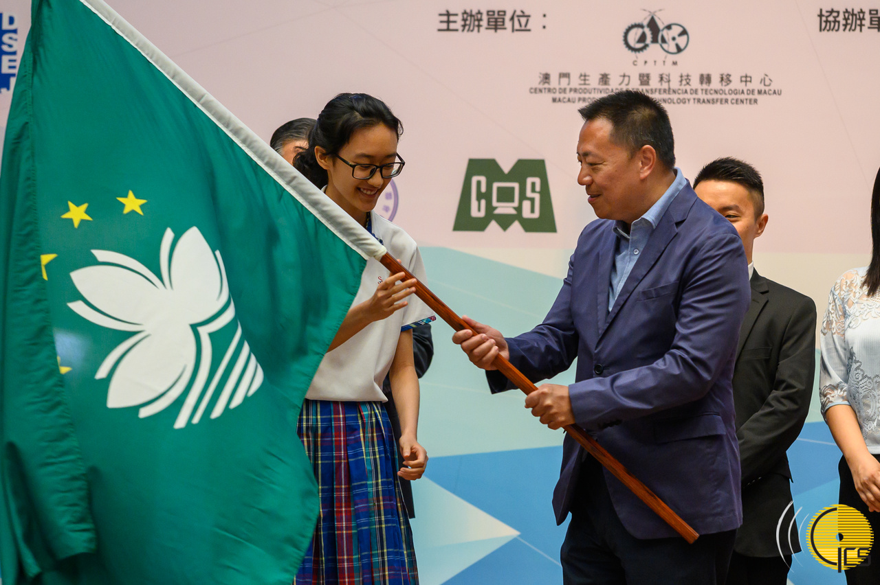 • The Secretary for Economy and Finance, Mr Leong Vai Tac, presents the flag of the Macao SAR to students representing the Macao SAR in the 2019 Microsoft MOS / Adobe ACA world championship.