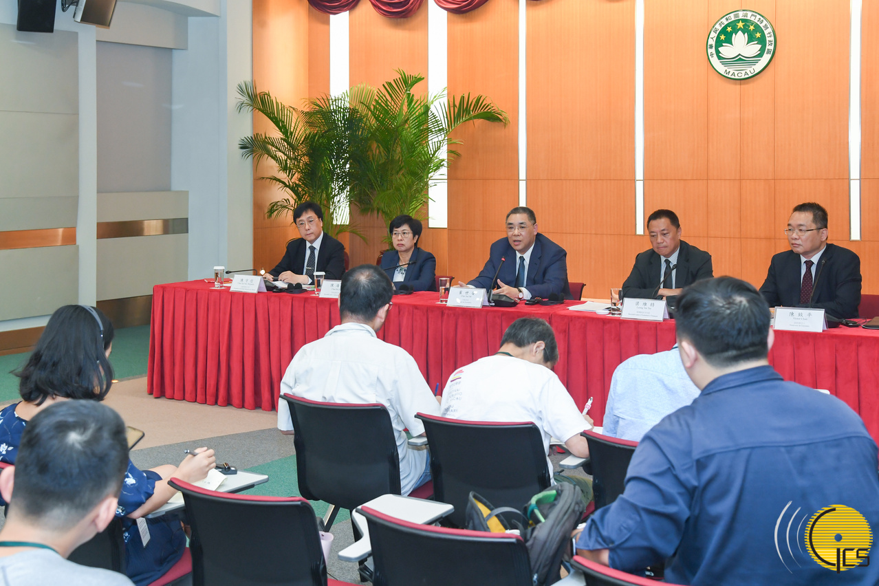 The Office of the Government Spokesperson holds a press conference to provide more details on the Government’s request filed to the Legislative Assembly regarding removal of two bills — amendments to the Budget for the Fiscal Year 2019 and amendments to Law on Combating Computer Crime — to be discussed at the Legislative Assembly. Official attending the press conference are the Chief Executive, Mr Chui Sai On; the Secretary for Administration and Justice, Ms Chan Hoi Fan; the Secretary for Economy and Finance, Mr Leong Vai Tac; the Government Spokesperson, Mr Chan Chi Ping; and the Chairman of the Board of Directors of the Macao Monetary Authority, Mr Chan Sau San.