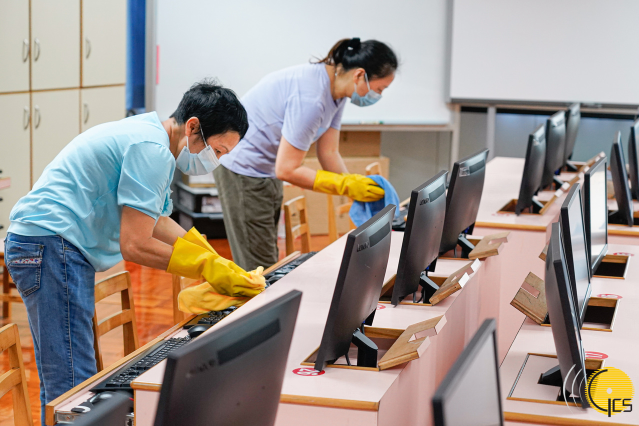 • School staff disinfect equipment and facilities in preparation for class resumption next week for Primary 4 to Primary 6 students.