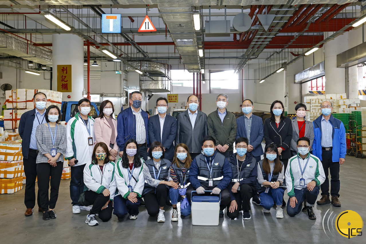 • The Chief Executive, Mr Ho Iat Seng, poses for a group photograph with front-line officers from the Municipal Affairs Bureau's Laboratory Division during a visit to the wholesale market to learn more about food inspection and quarantine work.