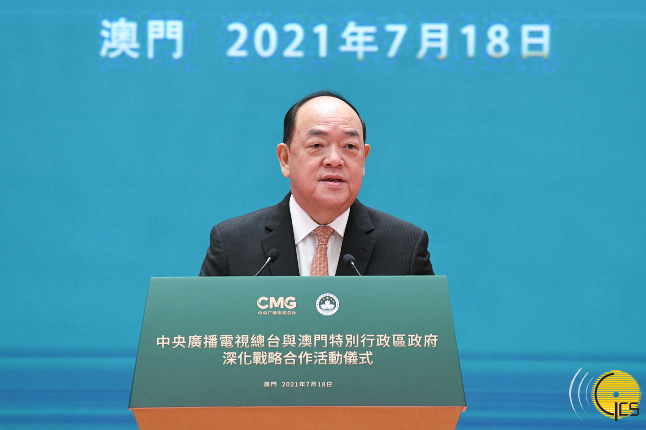 The Chief Executive, Mr Ho Iat Seng, attends a ceremony held in Macao to mark deepening strategic cooperation between the China Media Group and the Macao Special Administrative Region Government.