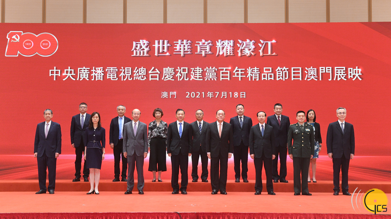 • The Chief Executive, Mr Ho Iat Seng, and Vice Minister of the Publicity Department of the CPC Central Committee and President of China Media Group, Mr Shen Haixiong, officiate at a ceremony to mark the launch in Macao of China Media Group's original productions themed the 100th anniversary of founding of the Communist Party of China.
