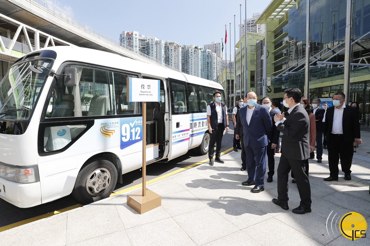 • The Chief Executive, Mr Ho Iat Seng, is briefed on the preparations and facilities for mobile polling stations in an emergency of setting up epidemic-control zones (Red Health Code zones) due to a COVID-19 outbreak.