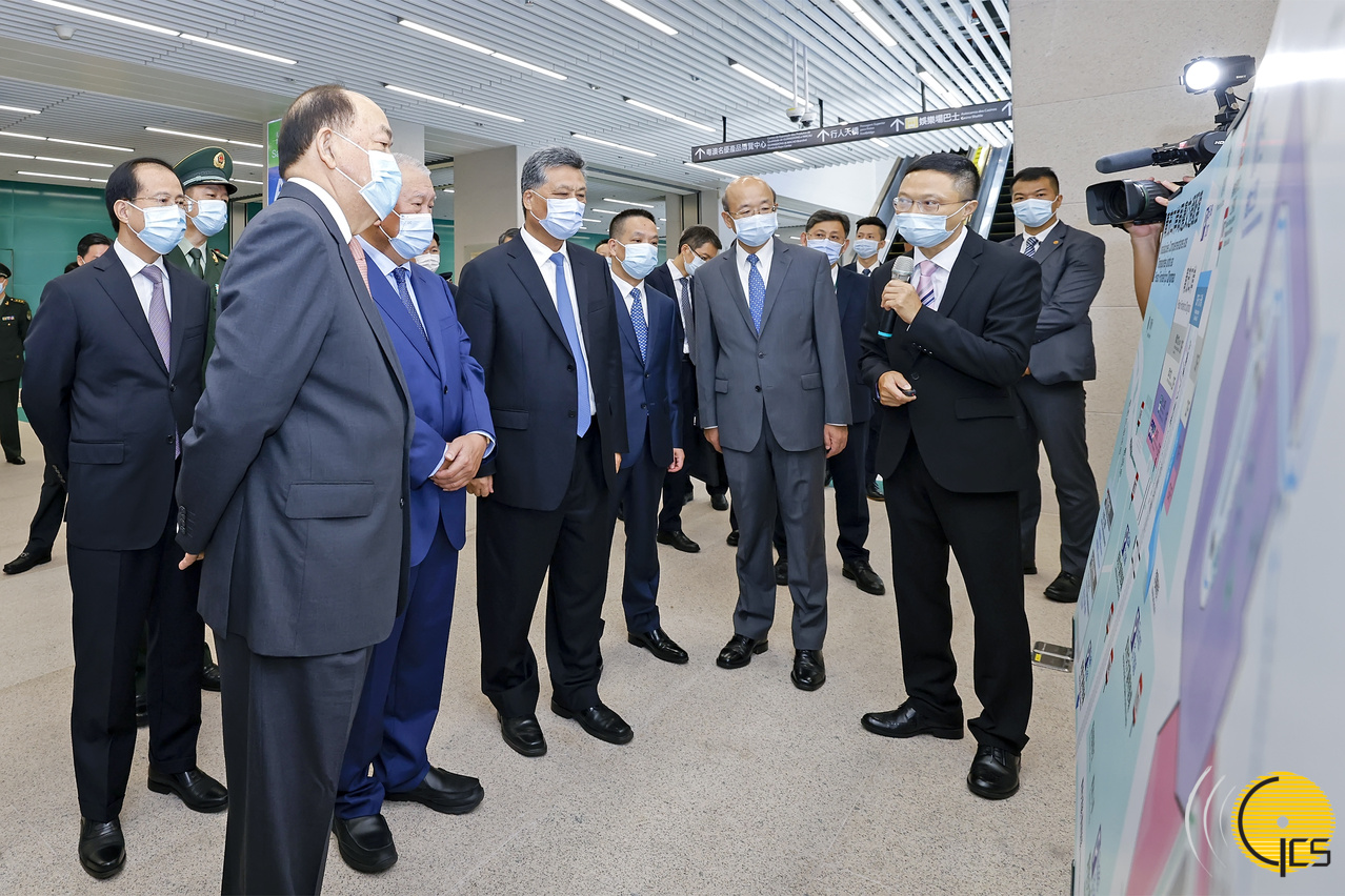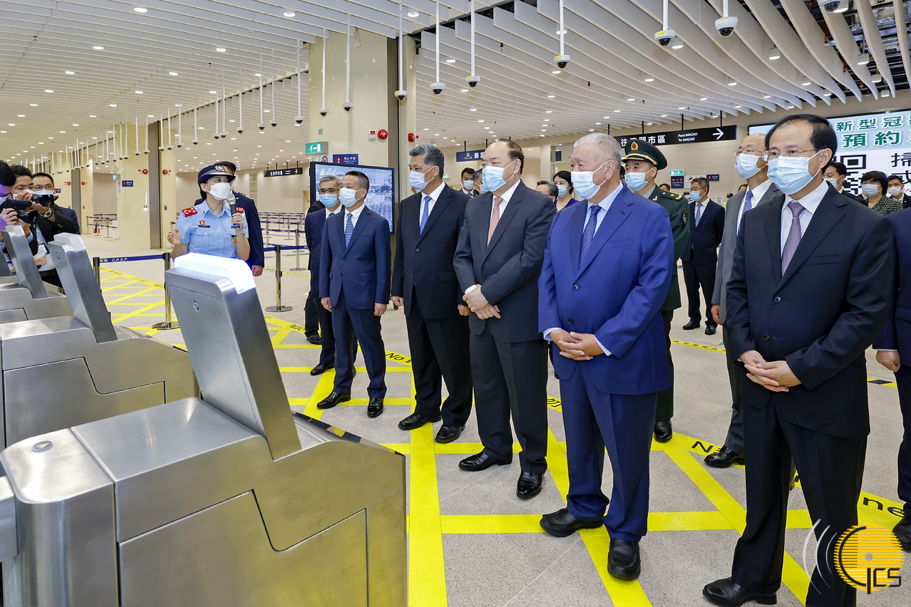 • The Chief Executive, Mr Ho Iat Seng, and the Governor of Guangdong Province, Mr Ma Xingrui, are briefed by Judiciary Police officer on the work of Macao area serving the Guangdong-Macao boundary crossing point (Qingmao Checkpoint).