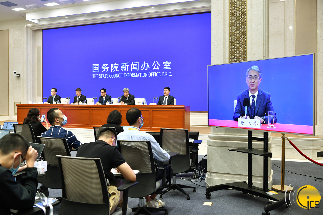 • The Secretary for Administration and Justice, Mr Cheong Weng Chon, represents the Macao Special Administrative Region in a press conference regarding the development of Hengqin and Qianhai held in Beijing by the State Council Information Office and takes reporters' questions via video link. (Photo from the State Council Information Office)