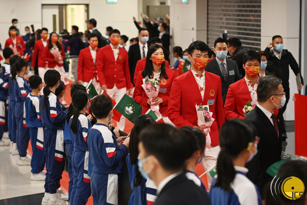 • More than 100 local students welcome the Delegation of Elite National Olympic Athlete at the Macao Port serving the Hong Kong-Zhuhai-Macao Bridge.