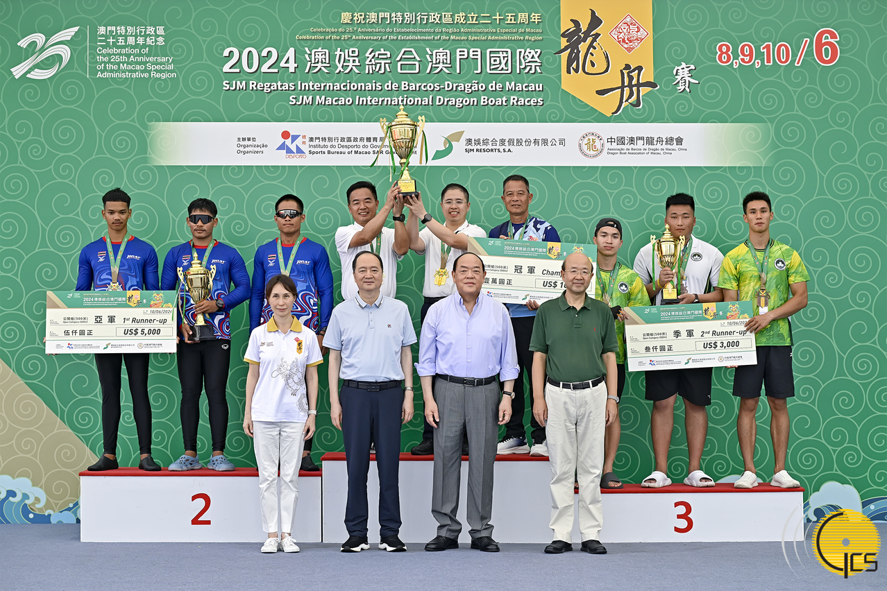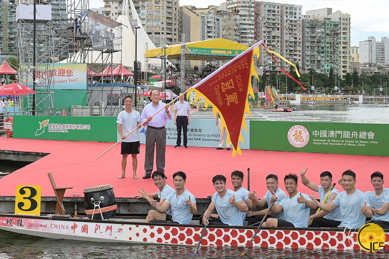 • The Chief Executive, Mr Ho Iat Seng, officiates at the award presentation ceremony for the standard dragon boat race under the open category of the 2024 Macao International Dragon Boat Races.