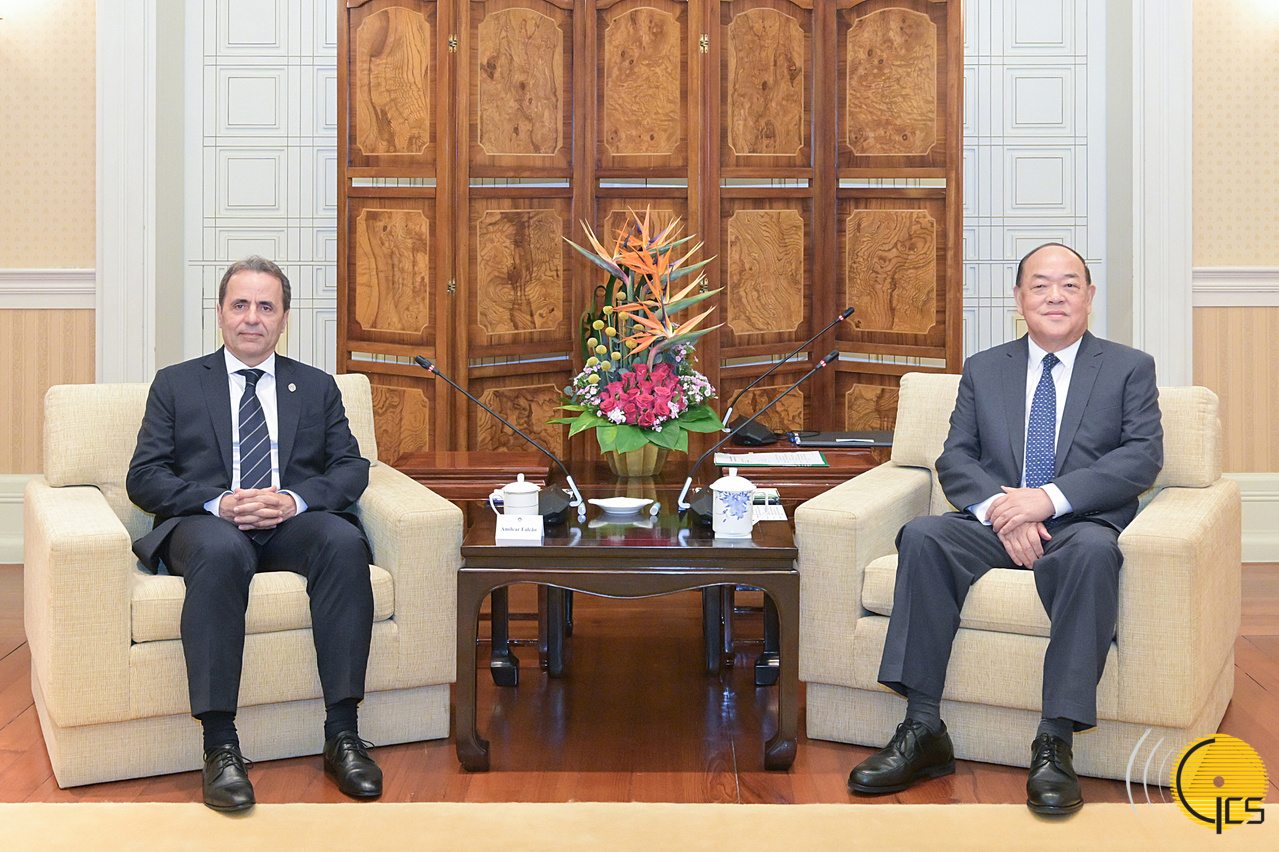 The Chief Executive, Mr Ho Iat Seng, meets with distinguished scientist, Rector of the University of Coimbra, and Honorary Doctor of Science of the Macao Polytechnic University, Mr Amílcar Falcão, at the Government Headquarters in Macao.