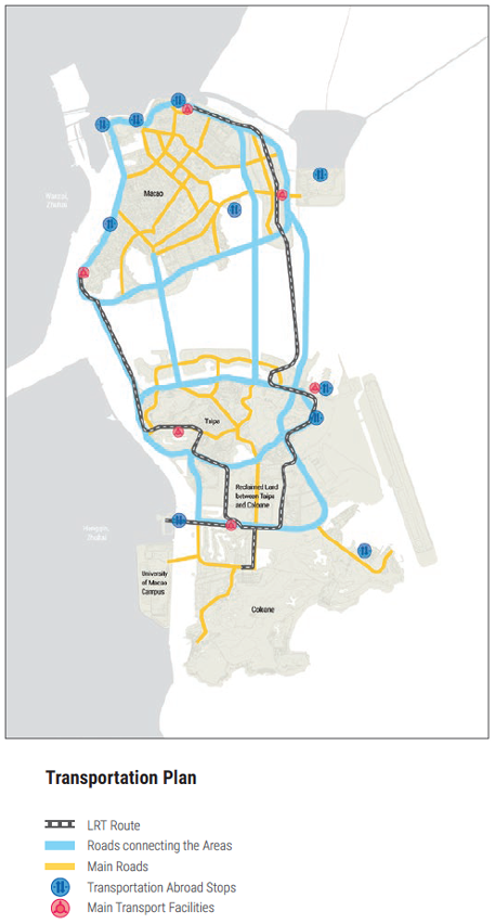 The plan emphasises the Light Rapid Transit (LRT) network that will eventually link the Gongbei border crossing from the mainland to Taipa island through an underwater tunnel, and also from Taipa to the Macao Inner Harbour, as well as from Taipa to Hengqin Island and Seac Pai Van Housing State in Coloane close to the future Islands Healthcare Complex. Aside from the Gongbei tunnel, the latter projects are due to be finished by 2023.