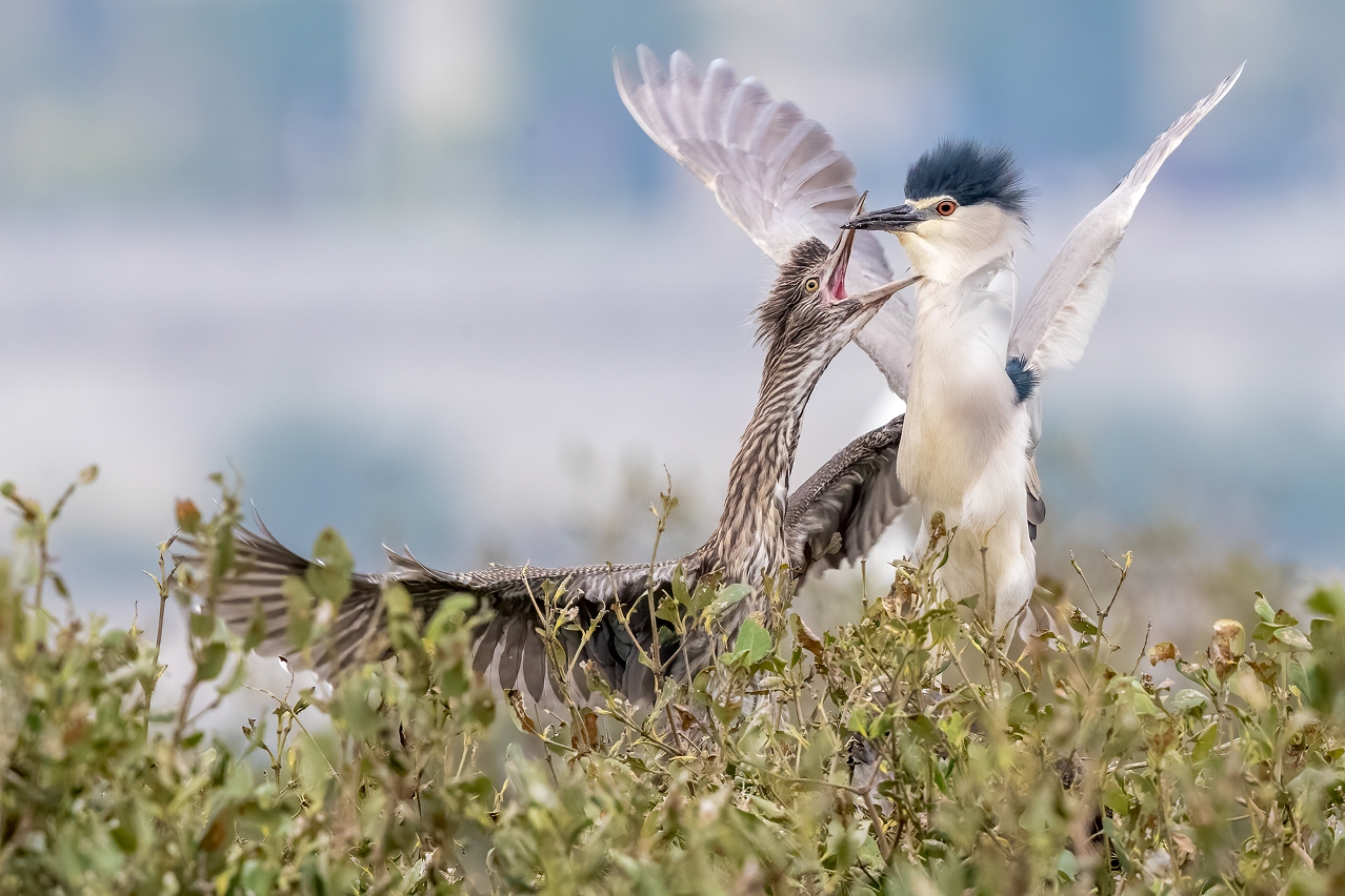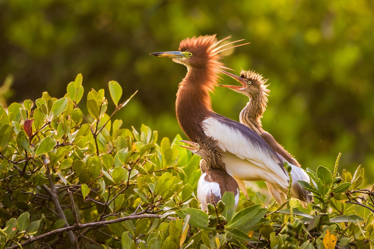 The Chinese pond heron (Ardeola bacchus) goes hunting for insects and fish early in the morning or late in the evening. Like the great egret, this bird also appears in breeding plumage alongside two chicks. In winter, the plumage changes to brown and white, similar to its babies’ | Photo by João Monteiro