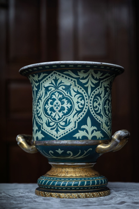 Guangcai is sometimes described as being ‘woven with gold and layered with jade’. Weaving with gold is in reference to what Lei believes to be the ceramic style’s aesthetic inspiration: Cantonese embroidery. “In Cantonese embroidery, gold threads are woven on the cloth as a base layer,” he explains. “On top of that, you embroider auspicious motifs, such as dragons, phoenixes, bats, fruits and flowers. The composition is dense and rich in imagery.”