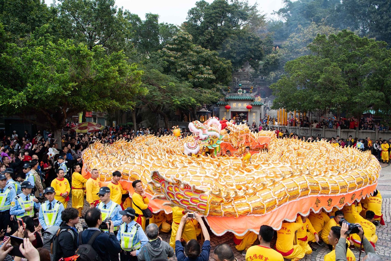 The dance is traditionally divided into two main styles: the “Southern Dragon” and the “Northern Dragon”. The “giant golden dragon”, commonly seen in Macao, belongs to the Southern Dragon category and can reach lengths of over 10 metres. In its early days in Macao, performers carried the dragon wrapped in their bodies, with dancers in the rear rows following the movements of those at the front. This method later evolved into the contemporary performance, in which long poles are used to lift and animate the dragon’s body.