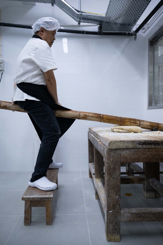 The traditional preparation involves the master sitting on the bamboo cane, repeatedly pressing and tapping the dough to make it compact — a process commonly referred to as “sitting on the bamboo cane” or “riding the cane”. Mastering this technique traditionally took apprentices several months or even a year.