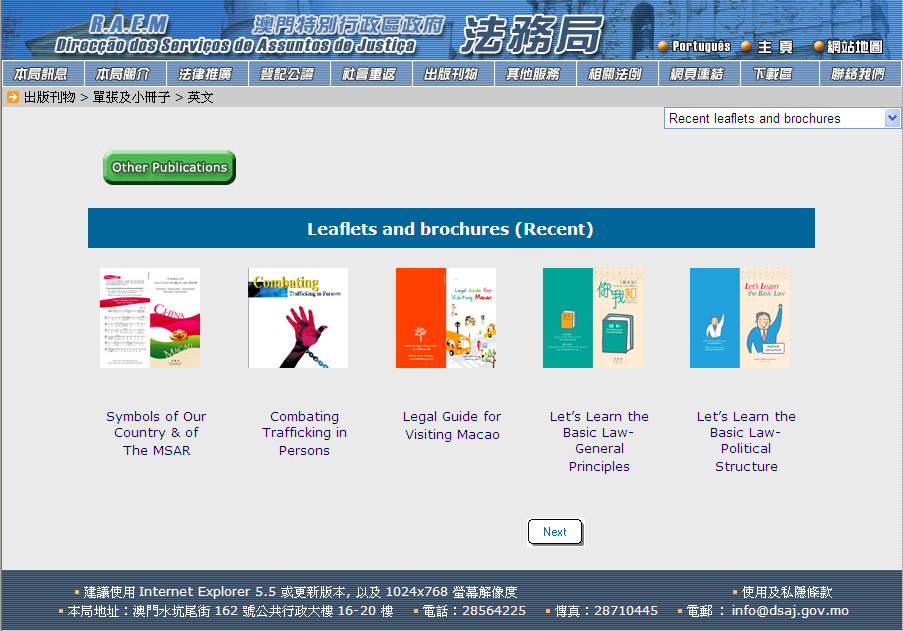 All these leaflets and booklets are available freely at the Legal Information Stands of Legal Affairs Bureau. To facilitate the consultation of the content of these leaflets and booklets by the citizens, Legal Affairs Bureau has launched recently an on-line service for law popularization publications on its website www.dsaj.gov.mo, through which citizens can see their content which is classified by the subject, namely: Basic Law and conventions, Property purchases, sales and rental, Parental authority and adoption, Criminal Prevention, Road Safety, Services provided by Legal Affairs Bureau and Others.
