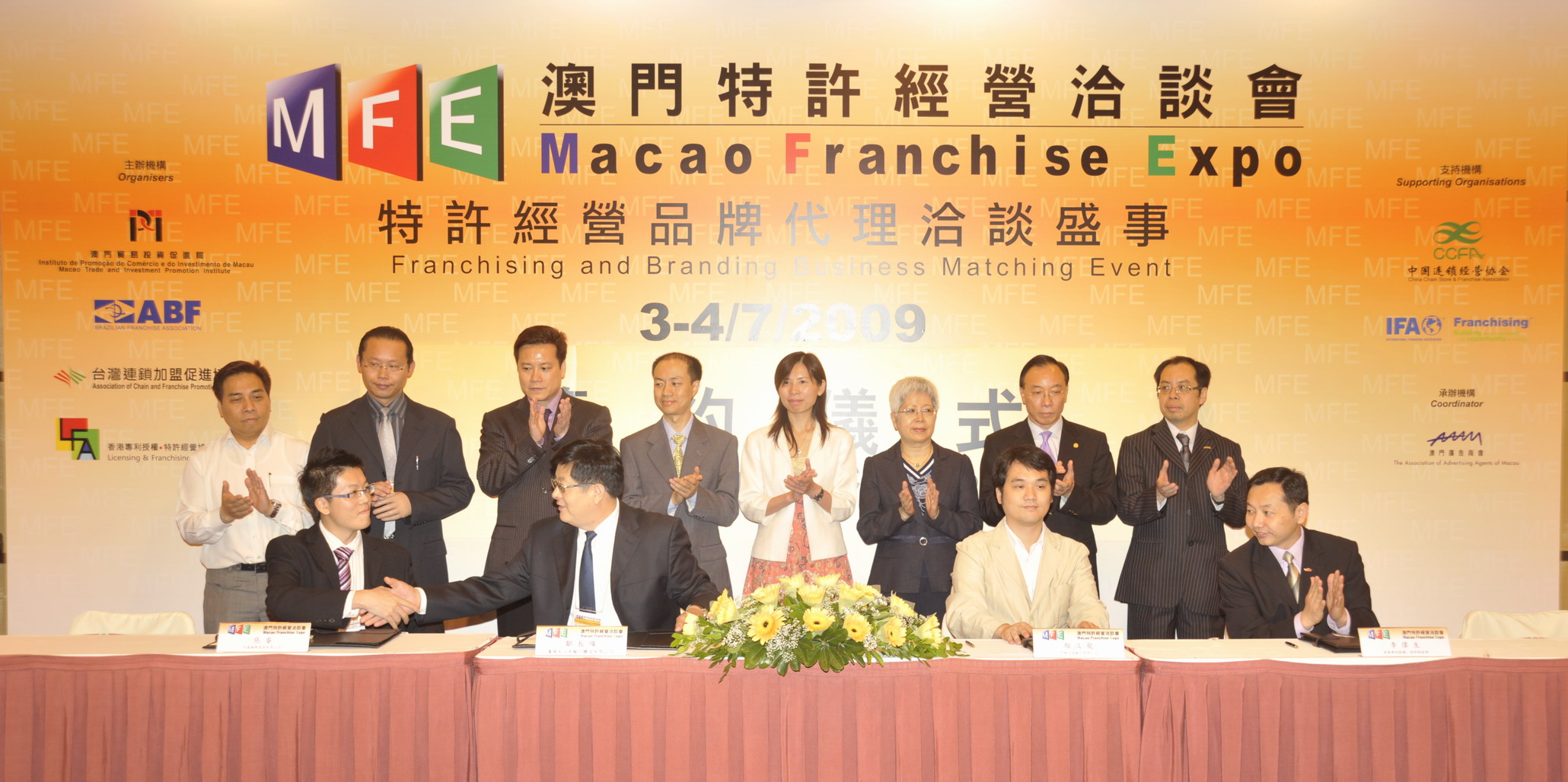 The second part of the signing ceremony was held at 3:30 p.m. this afternoon. Dr. Echo Chan, Executive Director of Macao Trade and Promotion Institute and concurrently Coordinator of the Macao Franchise Expo, Dra. Paula Ling Ling Hsião Yun, member of the People's Congress of the PRC and lawyer, Mr. He Jun, Director of China Chain Store & Franchise Association, Mr. Vong Kok Seng, Vice-Chairman of the Board of Directors of Macao Chamber of Commerce, Mr. Wu Ka I Miguel, Vice-President of Association of Property Agents and Realty Developers of Macao, Mr. Wilson Lee, President of Licensing & Franchising Association of Hong Kong, Mr. Chen Qingsheng, Vice-President of Chain Store & Franchise Association of Guangdong Province and President of the Association of Advertising Agents in Macao and Mr. Fong King Fu, Vice President of the United Association of Food and Beverage Merchants of Macaui were present at the signing ceremony.