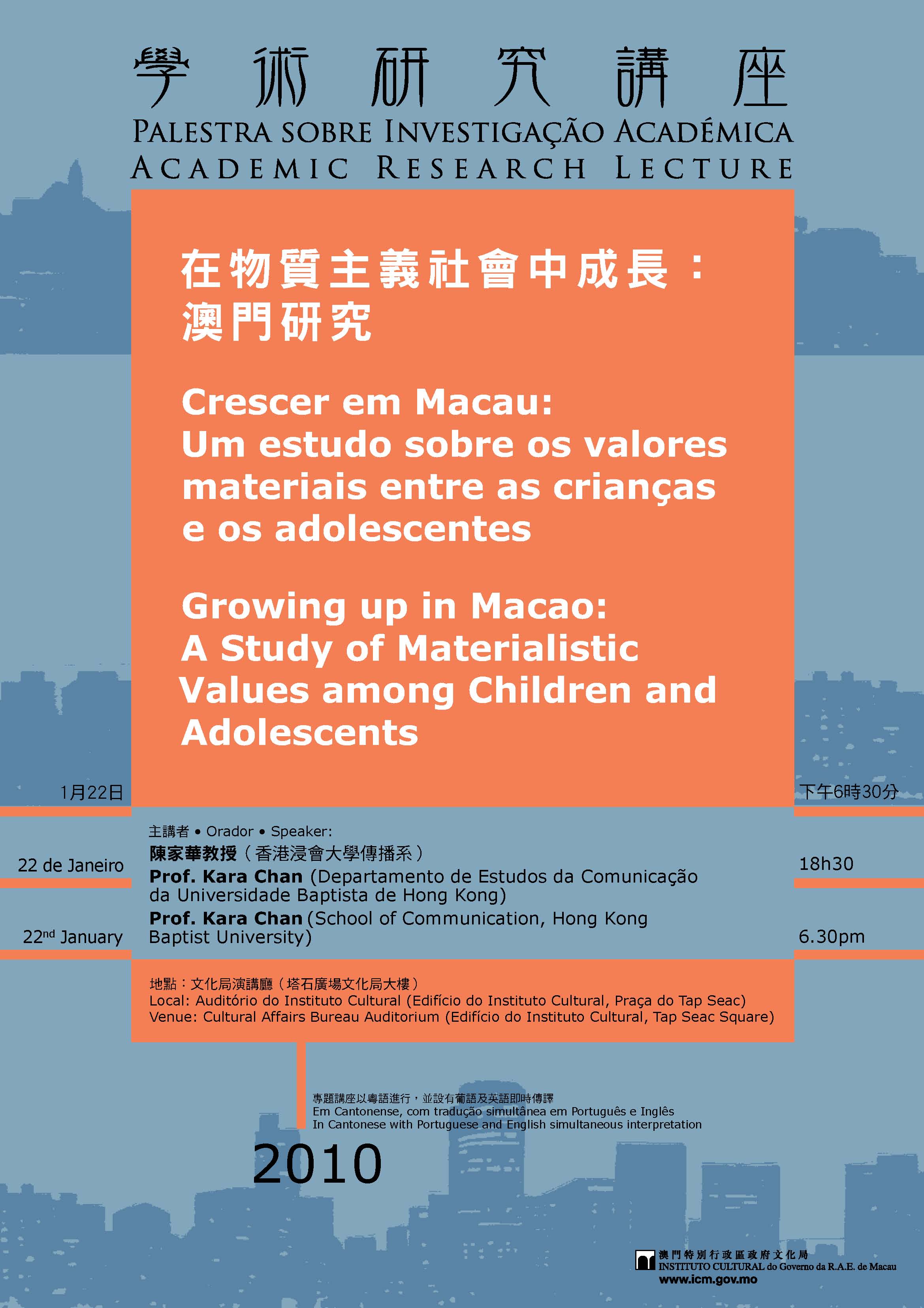 The Cultural Affairs Bureau of the Macao S.A.R. Government will organize an Academic Research Lecture in the Cultural Affairs Bureau Auditorium (Edifício do Instituto Cultural, Tap Seac Square, Macao) at 6:30pm on Friday 22 January. Kara Chan, Professor at the School of Communication, Hong Kong Baptist University, will give a lecture on “Growing up in Macao: A Study of Materialistic Values among Children and Adolescents”.