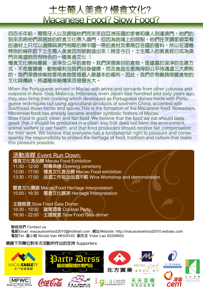 The Institute For Tourism Studies, Macao will host the “Macau Slow Food 2010 – Food Heritage of the Macanese” on 14 May. The event is organized by the Tourism Event Management and Heritage Management Year 2 Students and supported by the IFT Student Union. The objective of the event is to promote the philosophy of Slow Food culture, as well as the food heritage in Macao.
