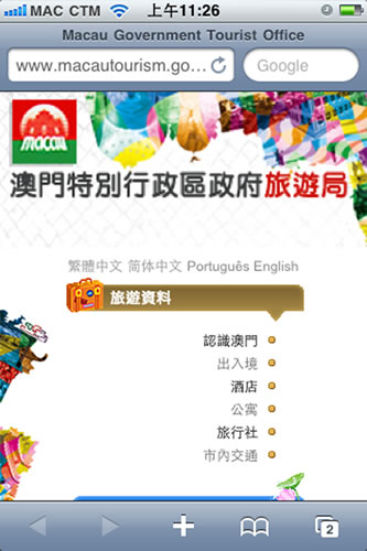 With the growing popularity of using mobile phones to go online, many tourists will utilize this technological means when traveling aboard. In line with the free wireless internet access service “Wi-Fi Go” launched by the Bureau of Telecommunication Regulation (DSRT) earlier this year, MGTO has been working on the development of a mobile version of its website. The web layout of the mobile version is customized for the small screen on a handset to give browsers a more user-friendly interface. The mobile version is available in Chinese (Traditional and Simplified), English and Portuguese.