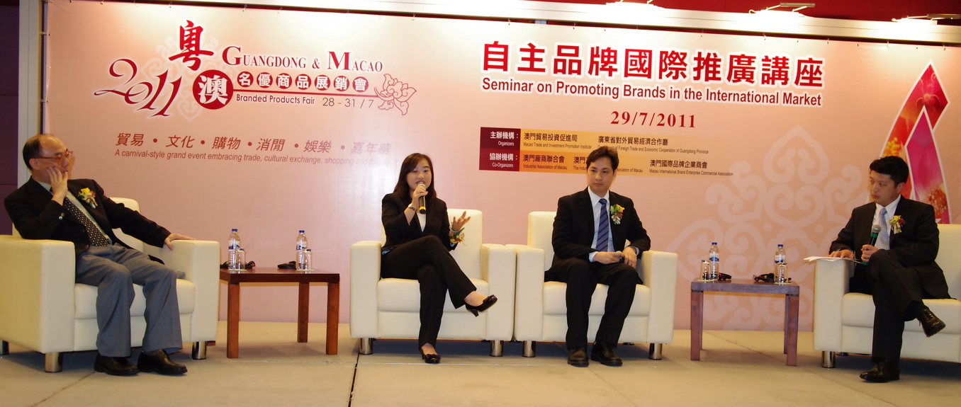 The “Seminar for Promoting Brands in the International Marketing” is the highlight on the second day of the Fair. Arranged by the Macao Trade and Investment Promotion Institute and the Department of Foreign Trade and Economic Cooperation of Guangdong Province, the Seminar took place at the Tourism Activities Centre at 10 a.m. today. Ms. Irene V. K. Lau, Executive Director of Macao Trade and Investment Promotion Institute and Mr. Zhong Jianhui, Deputy Director of Department of Foreign Trade and Economic Cooperation of Guangdong Province delivered their speeches at the Seminar. The Seminar aims to enhance the connection between the chambers of commerce of branded products and enterprises from Guangdong and from Macao, so as to promote cooperation on brand marketing and to explore more business opportunities. The Seminar is divided into two sessions: keynote speeches and a panel discussion. Dr. Cheris W.C. Chow from University of Macau shared her views and experiences on strategies of brand promotion, choice of marketing mode and other relative topics. The managing directors of two famous local brands “Wong Chi Kee” (Mr. Wong Kam Chun) and “Koi Kei” (Mr. Leong Chan Kuong) also shared their successful story in marketing their products. The Director of The Industry and Commerce Association of Macau Mr. Kevin Ho King Lun moderated the panel discussion with the group of speakers and discussed their experience in merchandising.