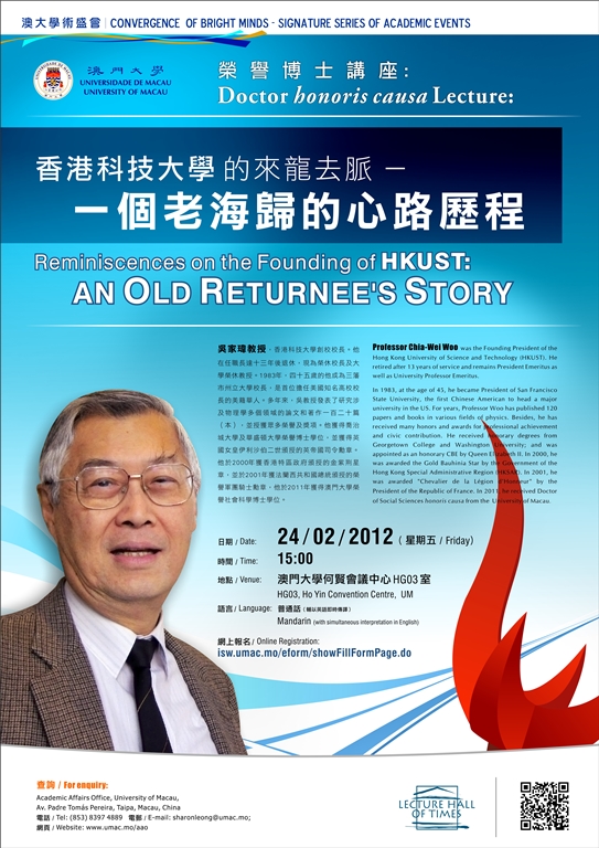 The University of Macau (UM) will hold a Doctor honoris causa Lecture entitled “Reminiscences on the Founding of HKUST: an Old Returnee’s Story” on 24 February 2012. Keynote speaker Prof. Chia-Wei Woo is a world-renowned physicist, educator, and doctor honoris causa of UM. He will share with the audience his several decades of experiences in education and research.