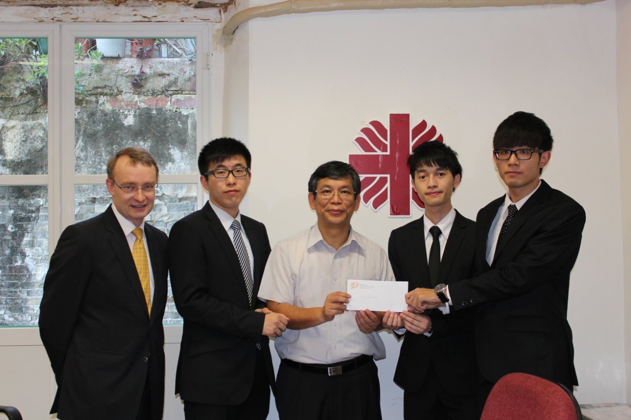 Paul Pun, Secretary of Caritas Macau received a donation of MOP 3000 on 9 May, 2012, the proceed of Terra Madre 2012, a Taste Education event organised earlier by Tourism Event Management Year 2 students of Institute for Tourism Studies at Mateus Ricci primary school, from the student representatives and Dr. Baudouin Neirynck (1st from left), President of Macau Slow Food Association.