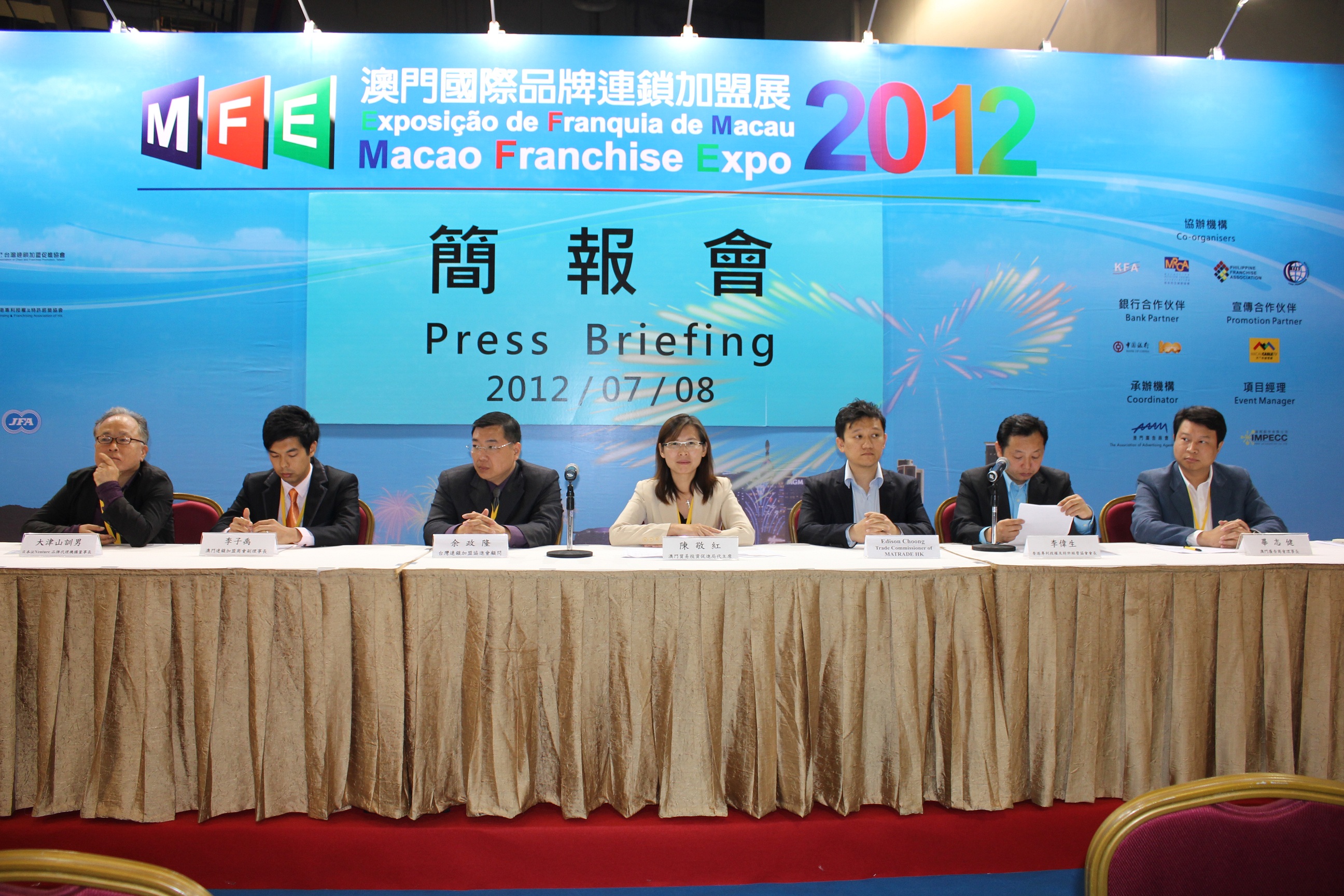 MFE 20I2 was organized by Macao Trade and Investment Promotion Institute (IPIM), Brazilian Franchise Association (ABF), Association of Chain and Franchise Promotion, Taiwan (ACFPT), Macao International Brand Enterprise Commercial Association (MIBA), Macao Chain Stores and Franchise Association (MCFA) and Licensing and Franchising Association of Hong Kong (LFA), supported by China Chain Store & Franchise Association (CCFA), International Franchise Association (IFA) and Japan Franchise Association (JFA), co-organized by Korea Franchise Association, Malaysian Retailer-Chains Association, Philippine Franchise Association and Thailand Franchise Association, and coordinated by Association of Advertising Agents of Macao. The slogan this year was “Brand Expansion Continues, Business Opportunities to be seized”.