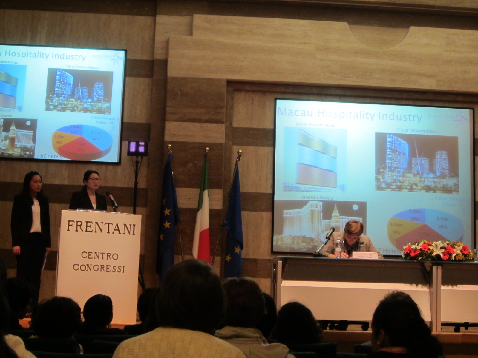 The topic of Incontro Romano 2013 is “Festival, the art of surprising”. Over 300 people from Japan, America, Italy, Spain, Macao and other countries or regions attended the Congress. The IFT students successfully entered into the final round and were invited to present their researches and projects and join the international fair. Amongst them, IFT Hotel Management Year 3 students Sarah Chen and Subraina Sun submitted a research paper “How Macao hospitality workers celebrate for the guests and for themselves” and presented how to make snowy moon-cake, traditional moon-cake and Chinese tea. In addition, three IFT Tourism Business Management students Alice Zhou, Lily Chen and Jelana Wang submitted a video to present Macauo's annual grand event - Lusofonia Festival, and unique traditions of Chinese minority groups at the fair.