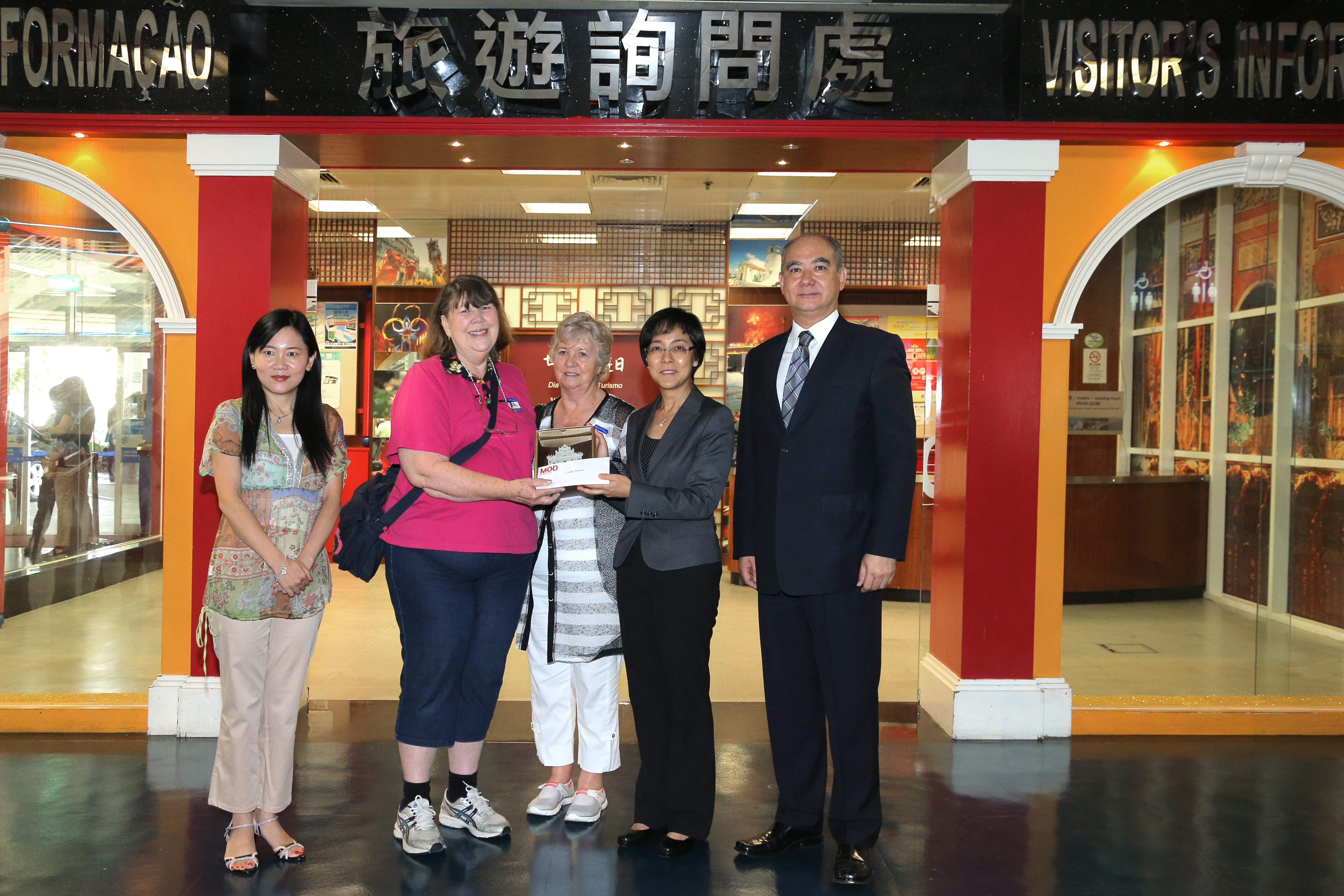 MGTO Director Senna Fernandes together with Deputy Directors Manuel Pires and Cecilia Tse arrived at Macau Ferry Terminal this morning to present welcome souvenirs to the lucky tourist today. Souvenirs were also distributed to visitors at MGTO Information Counters throughout the day. The lucky tourists of World Tourism Day came from Australia this year for a sightseeing trip to Macau World Heritage sites.