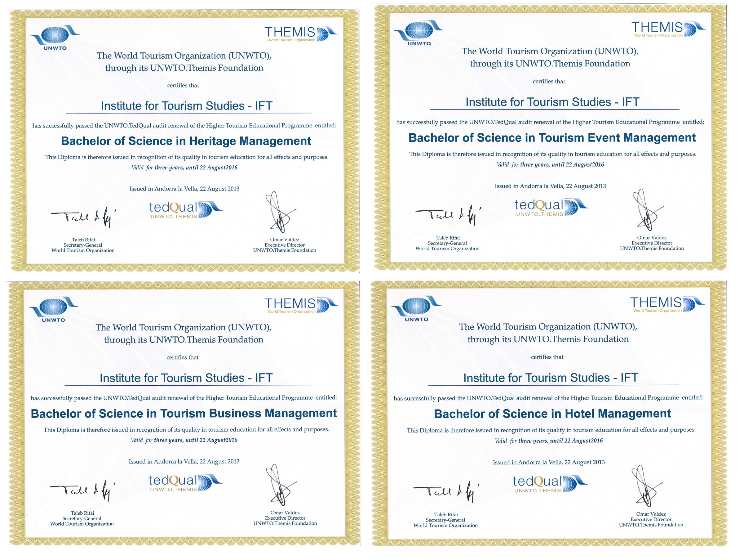 Institute for Tourism Studies (IFT) announces the renewal of the “TedQual Certification” granted to its bachelor degree programmes by the United Nations World Tourism Organization until August 2016.