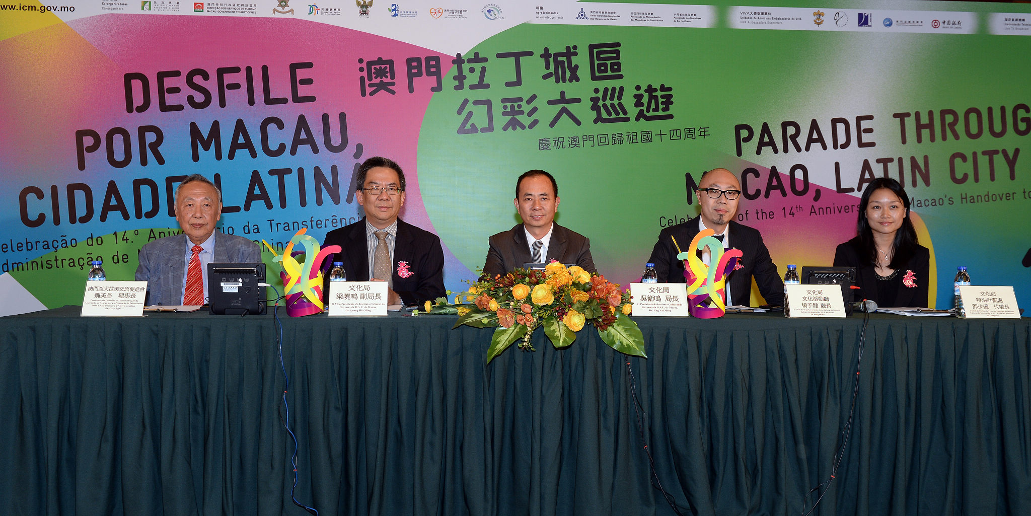 A press conference to present this year’s Parade took place on November 19, at the Tourism Activities Centre. Present were the President of the Cultural Affairs Bureau, Dr. Ung Vai Meng; the Vice-President of the Cultural Affairs Bureau, Dr. Leong Hio Ming; the President of the Board of the Macao Association for the Promotion of Exchange between Asia-Pacific and Latin America, Mr. Gary Ngai; the Chief of the Cultural Affairs Department, Mr. Ieong Chi Kin; and the Chief of the Special Projects Division, substitute, Ms. Chris Tang, as well as representatives of the local participating groups.