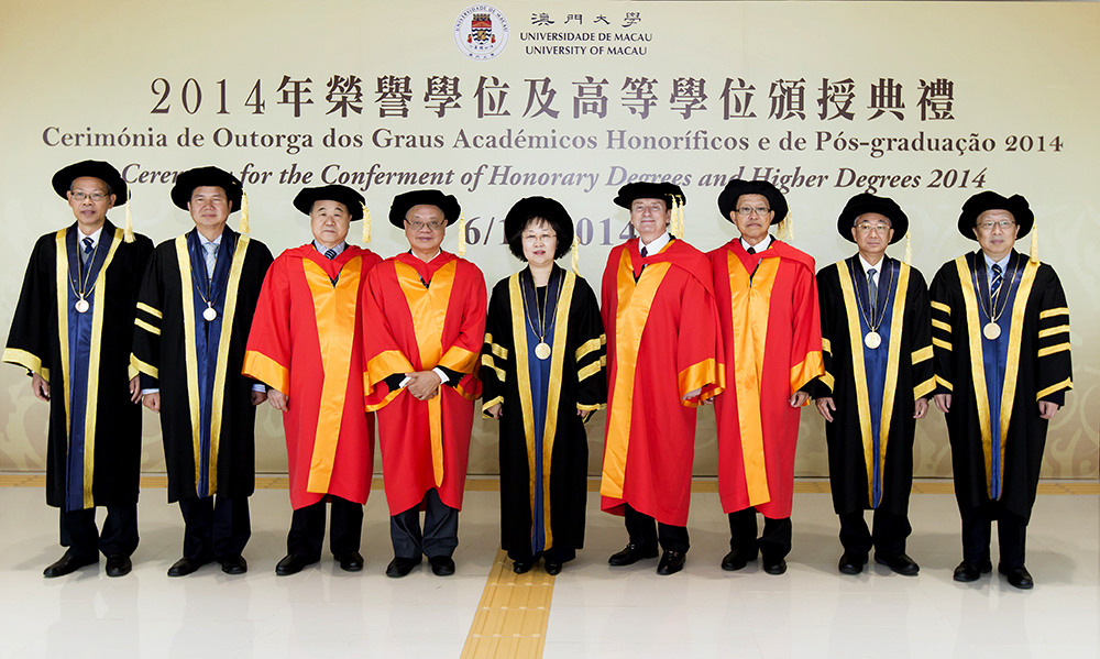 At the Ceremony for Conferment of Honorary Degrees and Higher Degrees held today (6 December), the University of Macau (UM) conferred honorary doctorates on two Nobel laureates, namely Prof Robert C Merton and Prof Mo Yan, as well as two distinguished individuals in the field of civil engineering, namely Prof Lee Chack Fan and Ir Siu Yin Wai, in recognition of their outstanding achievements and significant contributions to society and education. PhD degrees and master’s degrees were also awarded at the ceremony. Florinda Chan, acting chief executive of the Macao SAR and representative of the chancellor of UM, officiated at the ceremony. Chan said that UM’s new campus provides a very good platform for the long-term development of UM, adding that in the long run the campus will not only benefit UM, but will improve the overall quality of higher education in Macao.